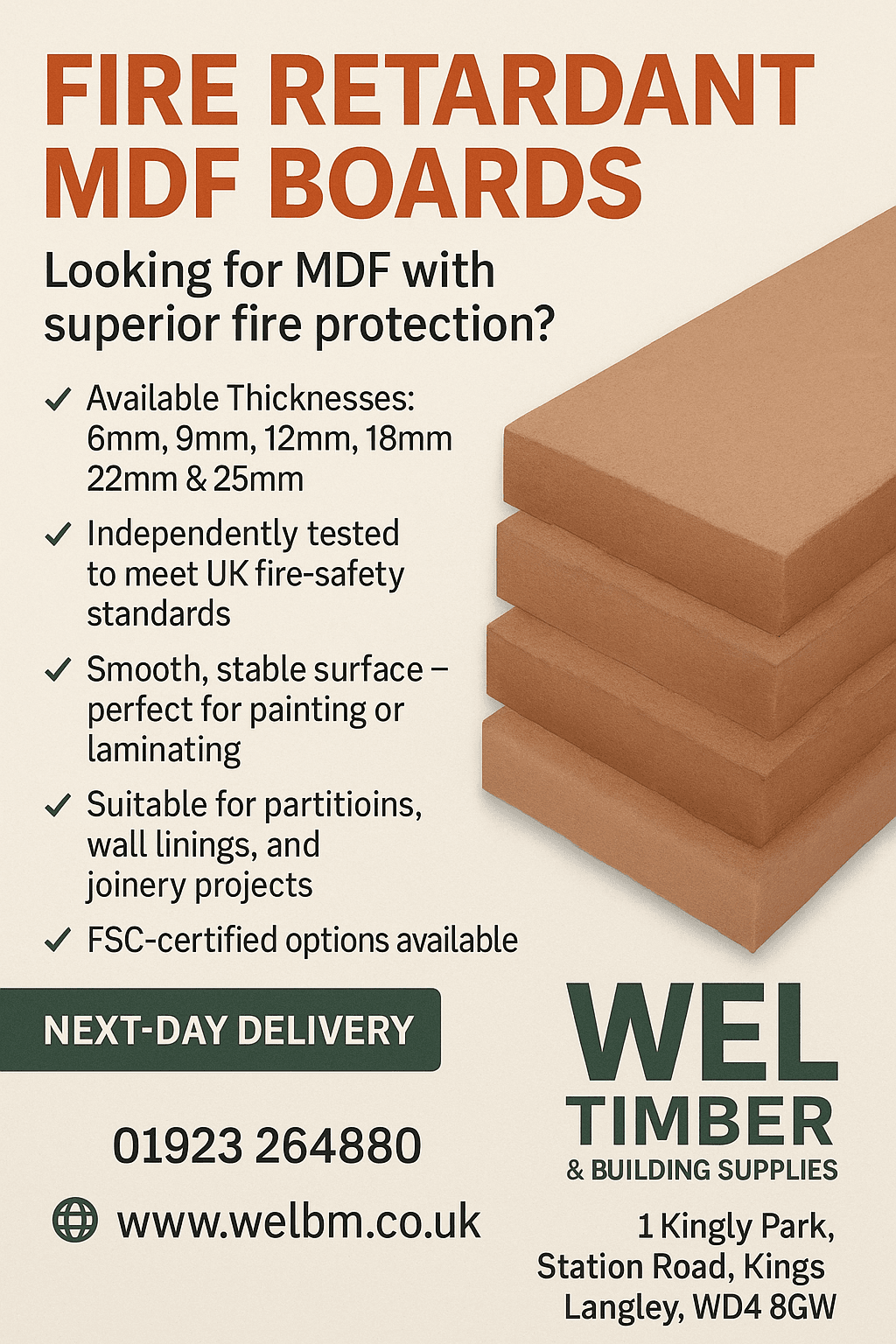 WEL Timber & Building Supplies stocks a full range of Fire Retardant MDF boards, ideal for commercial interiors, schools, hotels, and public buildings.